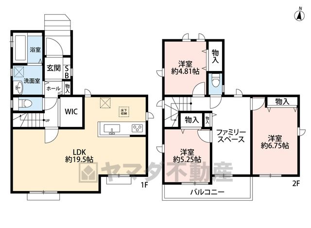▲1階LDK19.5帖、2階洋室全室収納付き ファミリースペース付き