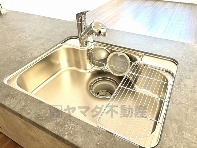 大きなお鍋も楽々洗える幅の広いシンクです^^ステンレスシンクなので簡単にお掃除できますよ。洗剤やスポンジもすっきりできる収納付き。