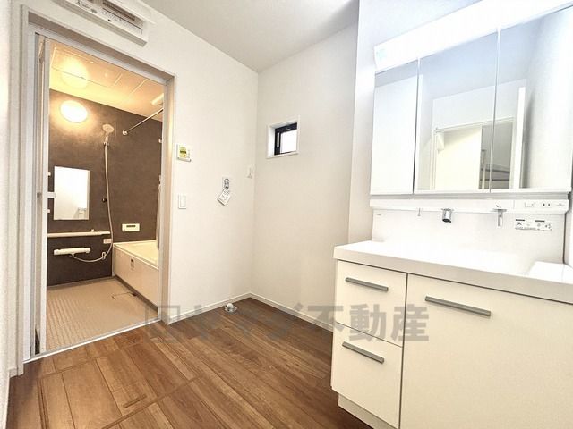 三面鏡にハンドシャワー付きで使いやすい洗面台です^^鏡裏と洗面ボウル下に収納付きの洗面台なので、整理整頓ができスッキリと使えます^^