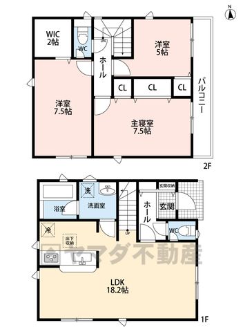 LDK18.2畳(1F)、洋7.5畳(2F)、洋5畳(2F) |