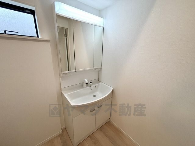 三面鏡裏収納付き洗面化粧台です^^ 鏡の裏に歯磨きセットやスキンケア用品などの収納できて便利ですね^^