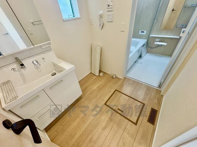 洗面台、洗濯機置き場、バスルームが連なっている、生活導線の考えられた作りになっています。脱衣スペースも広々と確保されていて嬉しいですね^^