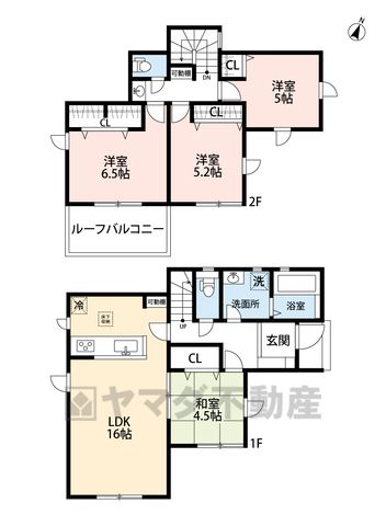 LDK16畳(1F)、洋5畳(2F)、洋5.2畳(2F)、洋6.5畳(2F)、和4.5畳(1F) |