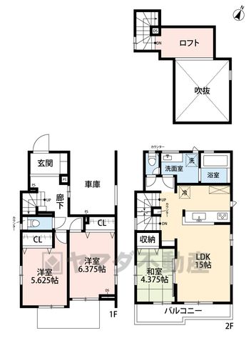 LDK15畳(2F)、洋5.6畳(1F)、洋6.3畳(1F)、和4.3畳(2F)、その他0畳 |