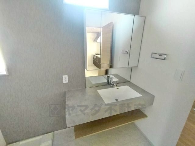 大きな鏡にハンドシャワー付きで使いやすい洗面台です^^鏡裏と洗面ボウル下に収納付きの洗面台なので、整理整頓ができスッキリと使えます^^