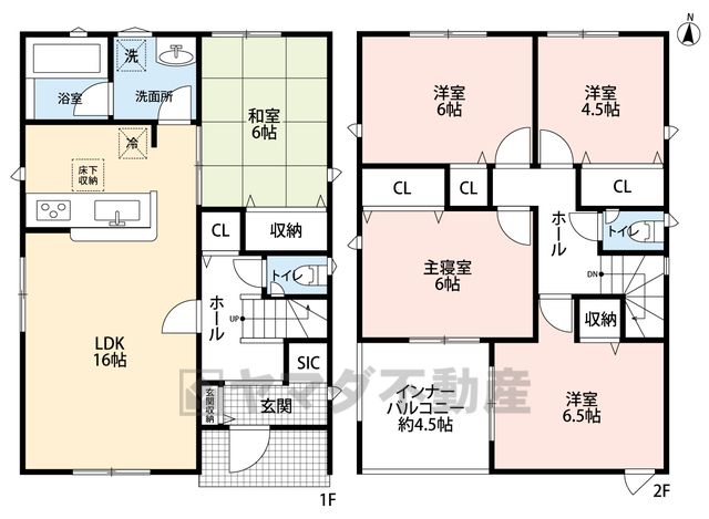 LDK16畳(1F)、和6畳(1F)、洋4.5畳(2F)、洋6畳(2F)、洋6.5畳(2F) |