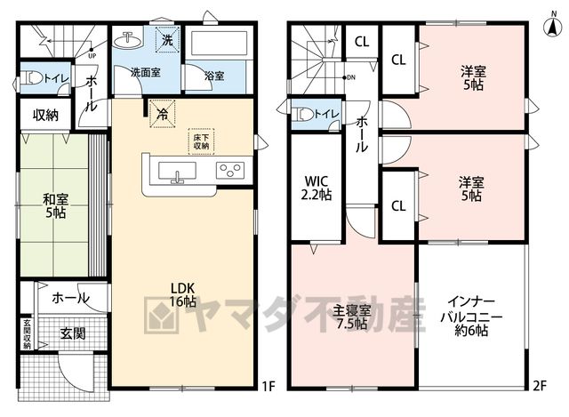 LDK16畳(1F)、和5畳(1F)、洋7.5畳(2F)、洋5畳(2F) |