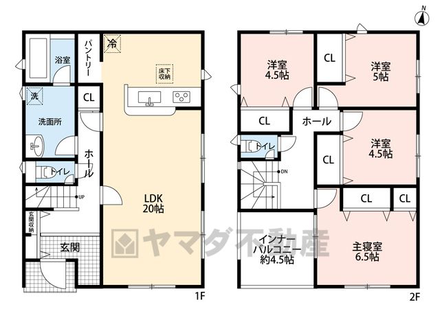 LDK20畳(1F)、洋6.5畳(2F)、洋4.5畳(2F)、洋5畳(2F) |