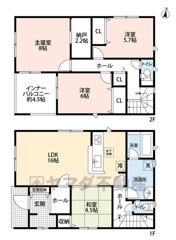 LDK16畳(1F)、洋8畳(2F)、洋5.7畳(2F)、洋6畳(2F)、和4.5畳(1F) |
