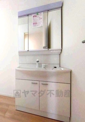 洗面台、洗濯機置き場、バスルームが連なっている、生活導線の考えられた作りになっています。