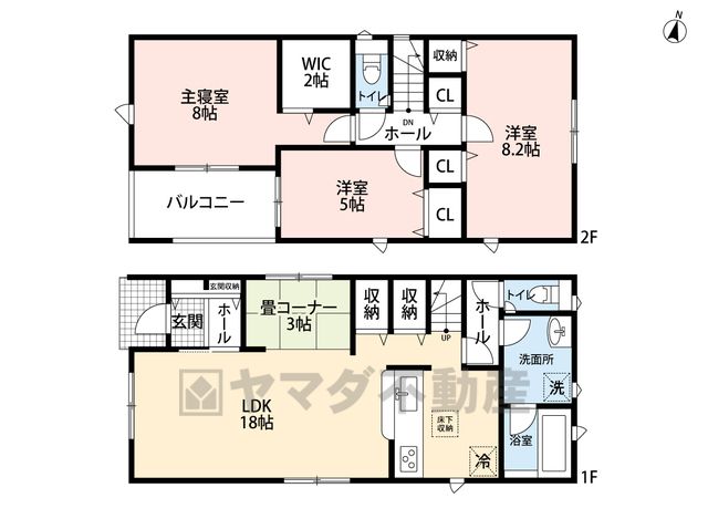 LDK18畳(1F)、洋8畳(2F)、洋8.2畳(2F)、洋5畳(2F)、S3畳(1F) |