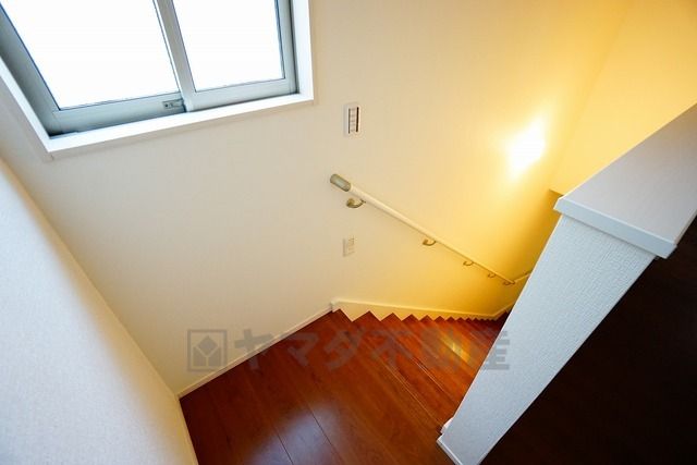 同仕様写真。小さなお子様やご高齢の方でも安心できる、手すり付き階段。段差も低めで設定されており、安全性にも優れています。