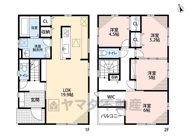 LDK19.9畳(1F)、洋4.5畳(2F)、洋5畳(2F)、洋5.2畳(2F)、洋6畳(2F) |