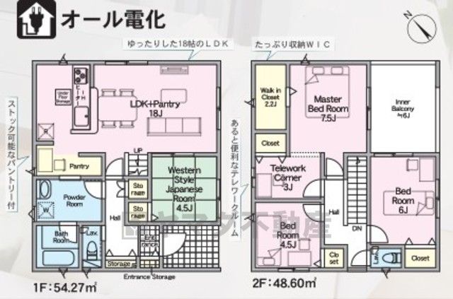 LDK18畳(1F)、和4.5畳(1F)、洋4.5畳(2F)、洋6畳(2F)、洋7.5畳(2F)、S3畳(2F) |