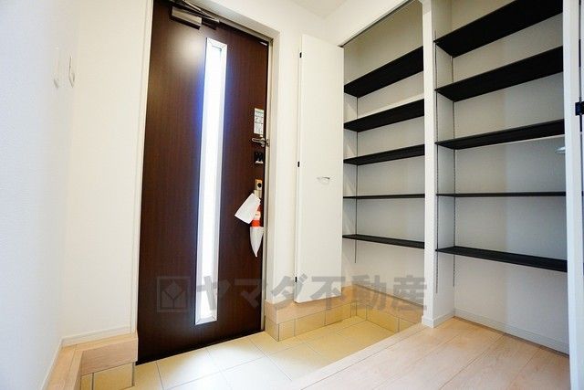 同仕様写真。白を基調とした明るい玄関です。大容量のシューズボックスは家族全員の増えがちな靴や物をすっきり収納できます。