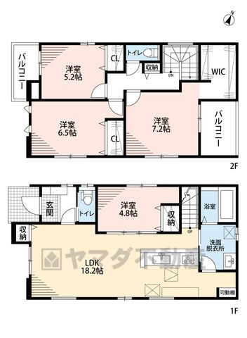 DK18.2畳(1F)、洋4.8畳(1F)、洋5.2畳(2F)、洋6.5畳(2F)、洋7.2畳(2F) |