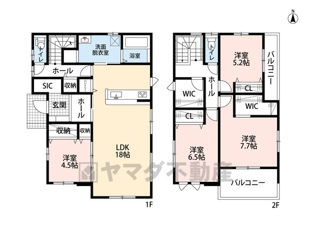 LDK18畳(1F)、洋4.5畳(1F)、洋5.2畳(2F)、洋6.5畳(2F)、洋7.7畳(2F) |