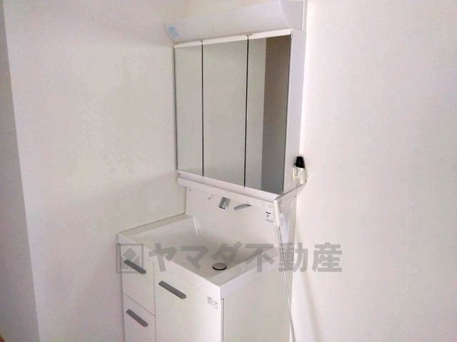 洗面台、洗濯機置き場、バスルームが連なっている、生活導線の考えられた作りになっています。