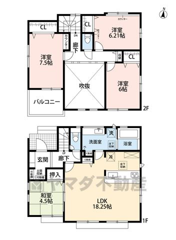 LDK18.2畳(1F)、和4.5畳(1F)、洋6畳(2F)、洋7.5畳(2F)、洋6.2畳(2F) |