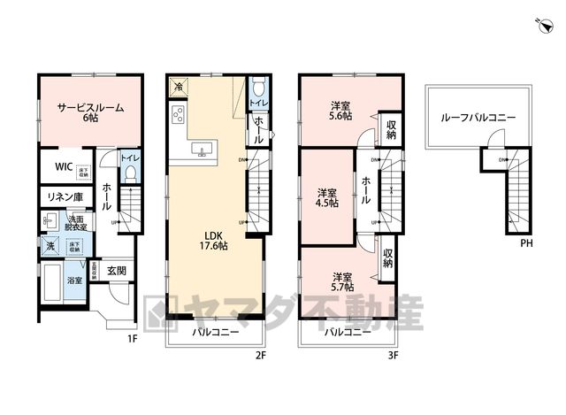 LDK17.6畳(2F)、S6畳(1F)、洋4.5畳(3F)、洋5.7畳(3F)、洋5.6畳(3F) |