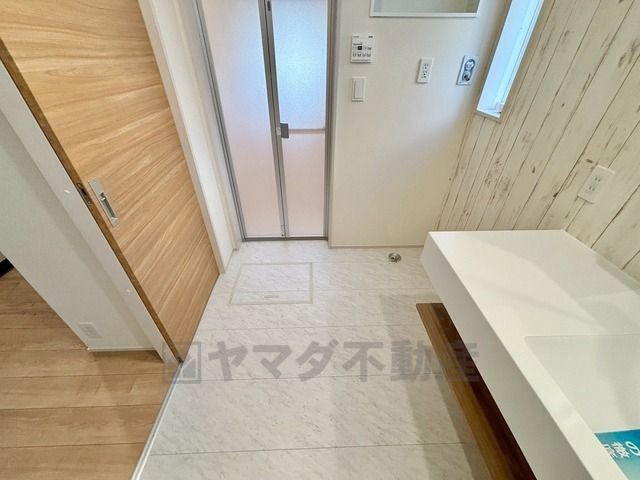 洗面脱衣室には可動式の棚が付いているので、タオルや着替えなども置くスペースが確保できて助かりますね。