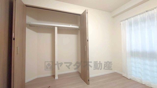 収納量たっぷりのクローゼット付です。ハンガーパイプ付で散らかりがちな洋服類もきれいに整理できます。使用頻度が少ないものは枕棚の上に、足元には3段ボックスを置いて、フル活用できるクローゼットです^^