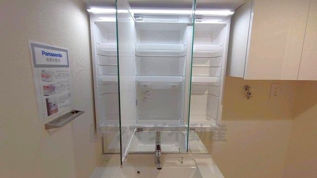 三面鏡にハンドシャワー付きで使いやすい洗面台です^^鏡裏と洗面ボウル下に収納付きの洗面台なので、整理整頓ができスッキリと使えます^^