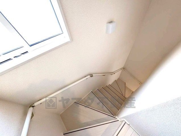 手すり付きの明るい階段です。