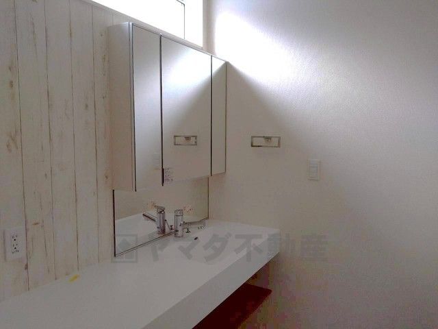 三面鏡にハンドシャワー付きで使いやすい洗面台です^^鏡裏と洗面ボウル下に収納付きの洗面台なので、整理整頓ができスッキリと使えます^^
