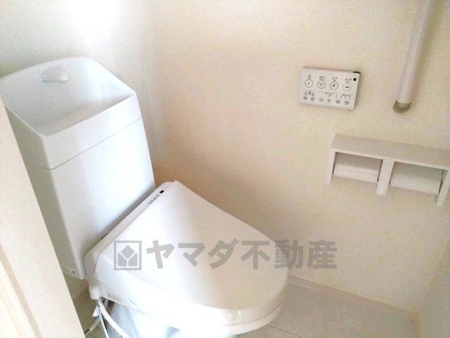 ウォシュレット付きトイレです。1階2階の2ヶ所にトイレがあるので、忙しい朝にもゆとりができますね^^ 温水洗浄便座リモコン付き。