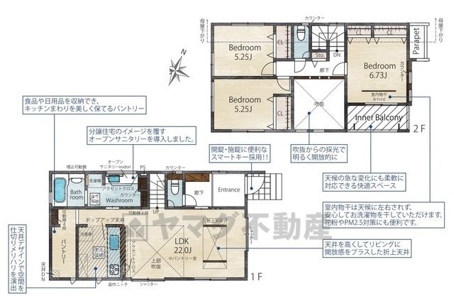 LDK22畳(1F)、洋5.2畳(2F)、洋6.7畳(2F) |