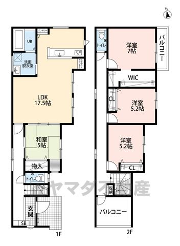 LDK17.5畳(1F)、和5畳(1F)、洋7畳(2F)、洋5.2畳(2F) |