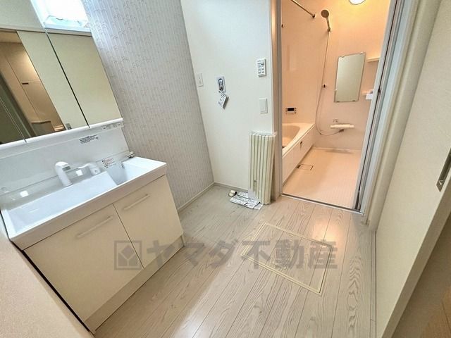 おしゃれな洗面台で広々と使いやすいです^^鏡裏と洗面ボウル下に収納付きの洗面台なので、整理整頓ができスッキリと使えます^^