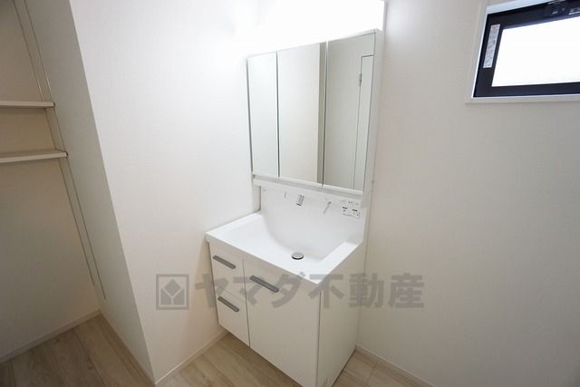 同仕様写真。現況と異なる場合は現況を優先します。棚が付いているので、タオルや着替えなども置くスペースが確保できて助かりますね。