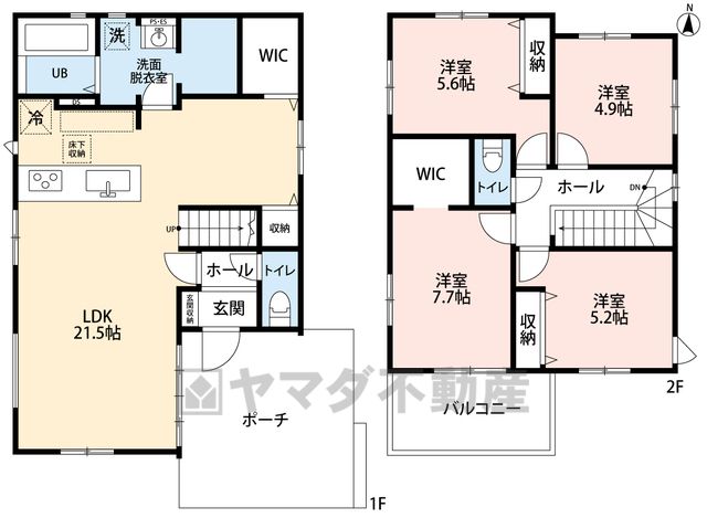 LDK21.5畳(1F)、洋7.7畳(2F)、洋5.2畳(2F)、洋4.9畳(2F)、洋5.6畳(2F) |