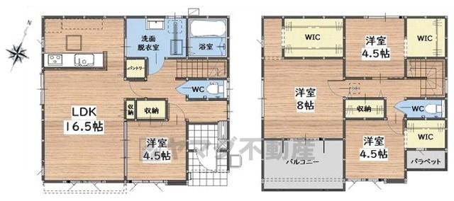 LDK16.5畳(1F)、洋4.5畳(1F)、洋4.5畳(2F)、洋8畳(2F) |