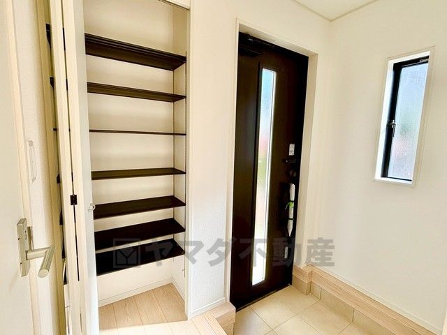 玄関扉から光の差し込む明るい玄関です。 たっぷり収納できるシューズボックス付きなので、家族全員の靴がきれいに整頓できます。