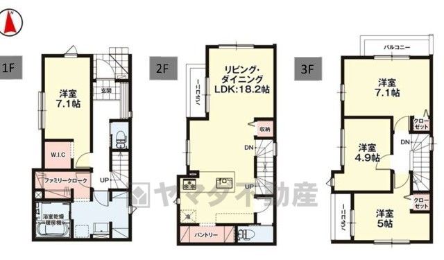 洋7.1畳(1F)、LDK18.2畳(2F)、洋7.1畳(3F)、洋5畳(3F)、洋4.9畳(3F) |