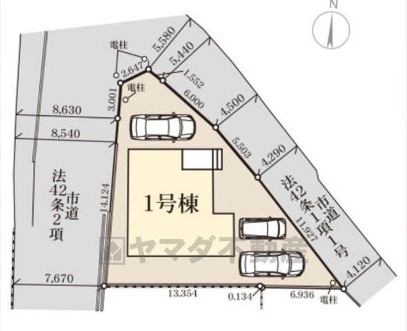 公道 北東 幅員4.1m 公道 西 幅員7.6m |