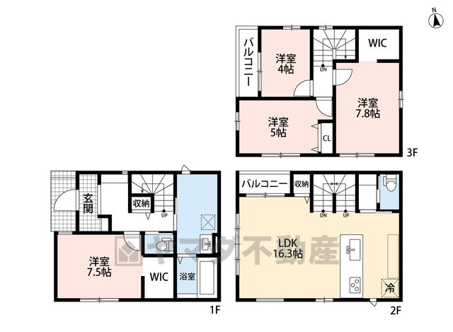 ▲4LDK 1F 7.5帖洋室 WIC 2F リビング16.3帖 収納スペース 3F 3洋室WIC