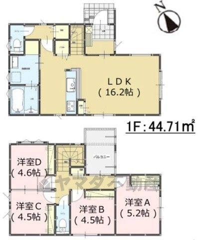 LDK16.2畳(1F)、洋5.2畳(2F)、洋4.5畳(2F)、洋4.6畳(2F)、洋0畳 |