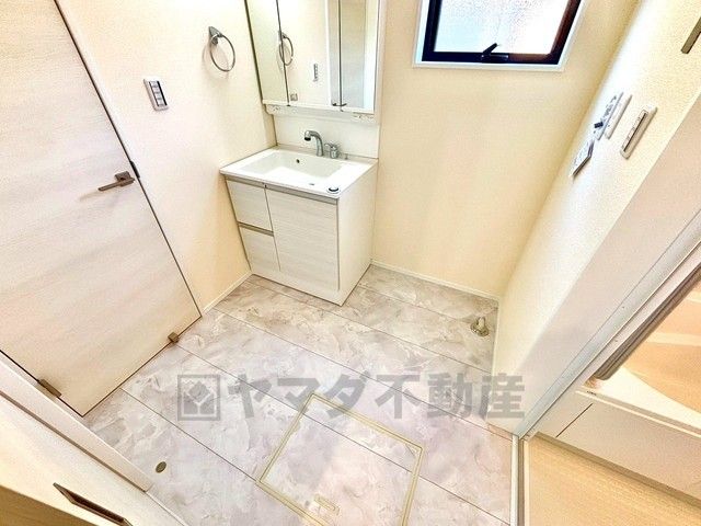 便利な三面鏡の洗面台です。すぐ近くに収納があるので散らかりがちなバスタオルや清掃用品、化粧品や予備のシャンプー等もきれいに整頓できますね。