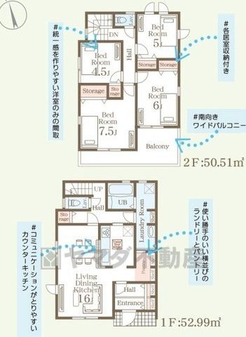 LDK16畳(1F)、洋7.5畳(2F)、洋6畳(2F)、和5畳(2F)、洋4.5畳(2F) |