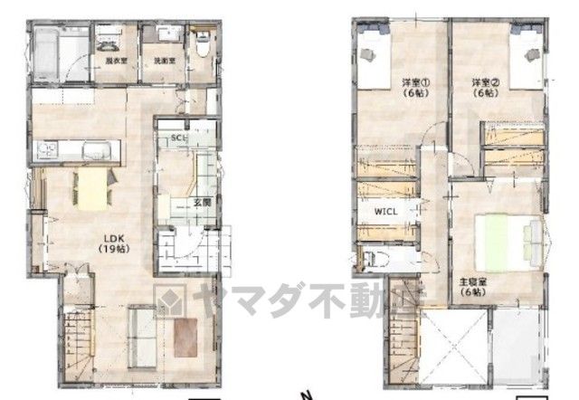 LDK19畳(1F)、洋6畳(2F) |