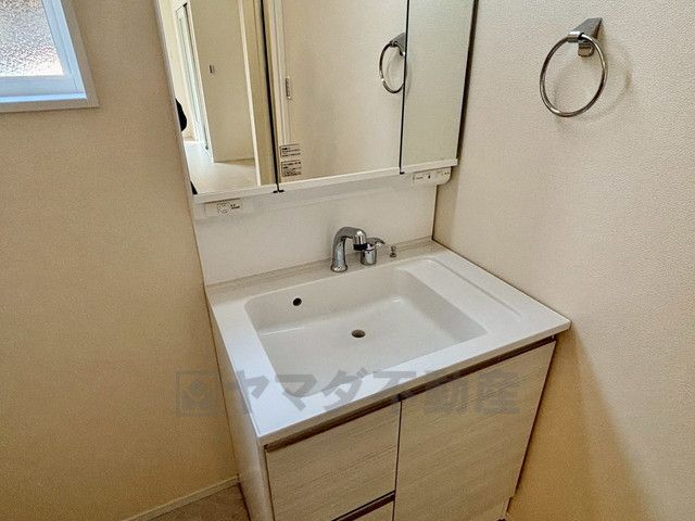 三面鏡にハンドシャワー付きで使いやすい洗面台です^^