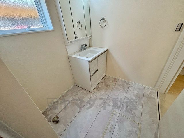 洗面台、洗濯機置き場、バスルームが連なっている、生活導線の考えられた作りになっています。