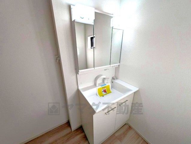 洗面台、洗濯機置き場、バスルームが連なっている、生活導線の考えられた作りになっています。