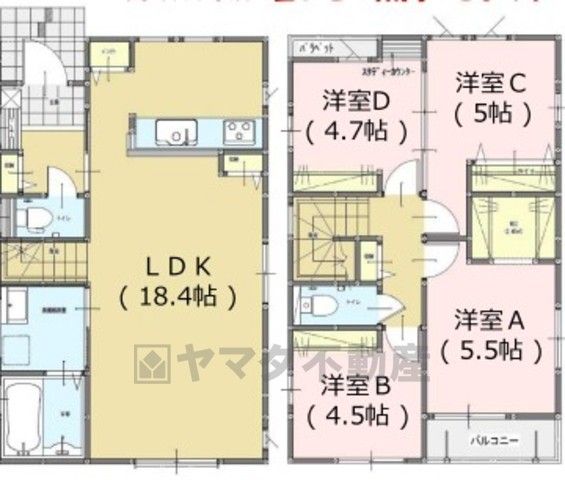 LDK18.4畳(1F)、洋5.5畳(2F)、洋5畳(2F)、洋4.7畳(2F)、洋4.5畳(2F) |