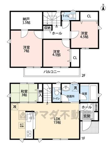 LDK15畳(1F)、洋4.5畳(2F)、洋7畳(2F)、和3畳(1F) |
