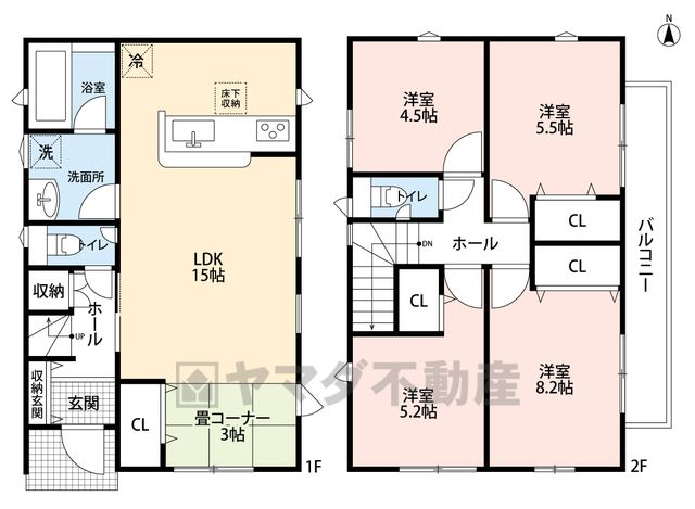 LDK15畳(1F)、洋4.5畳(2F)、洋5.2畳(2F)、洋5.5畳(2F)、洋6.2畳(2F)、和3畳(1F) |